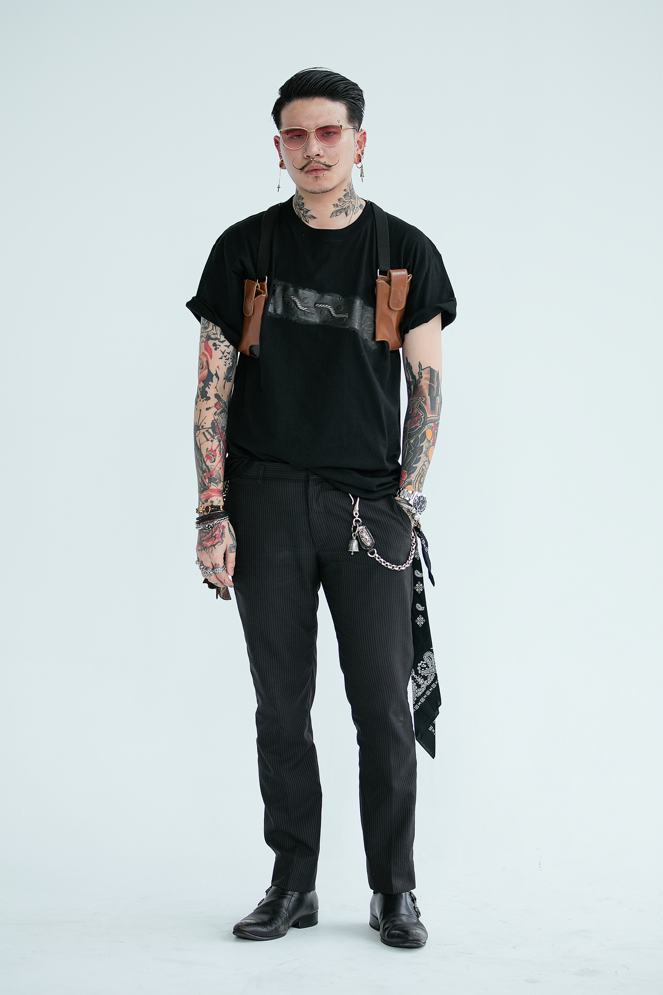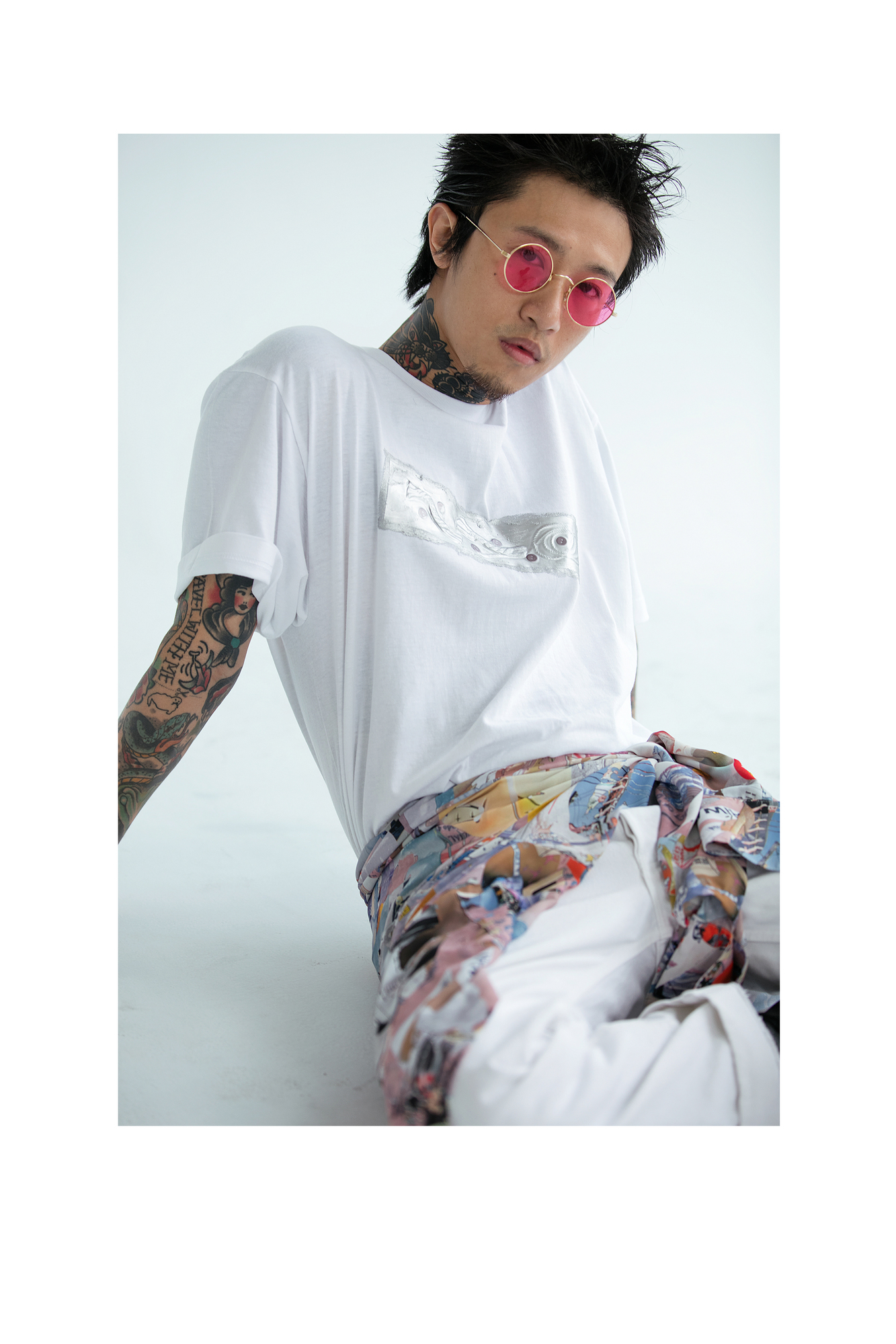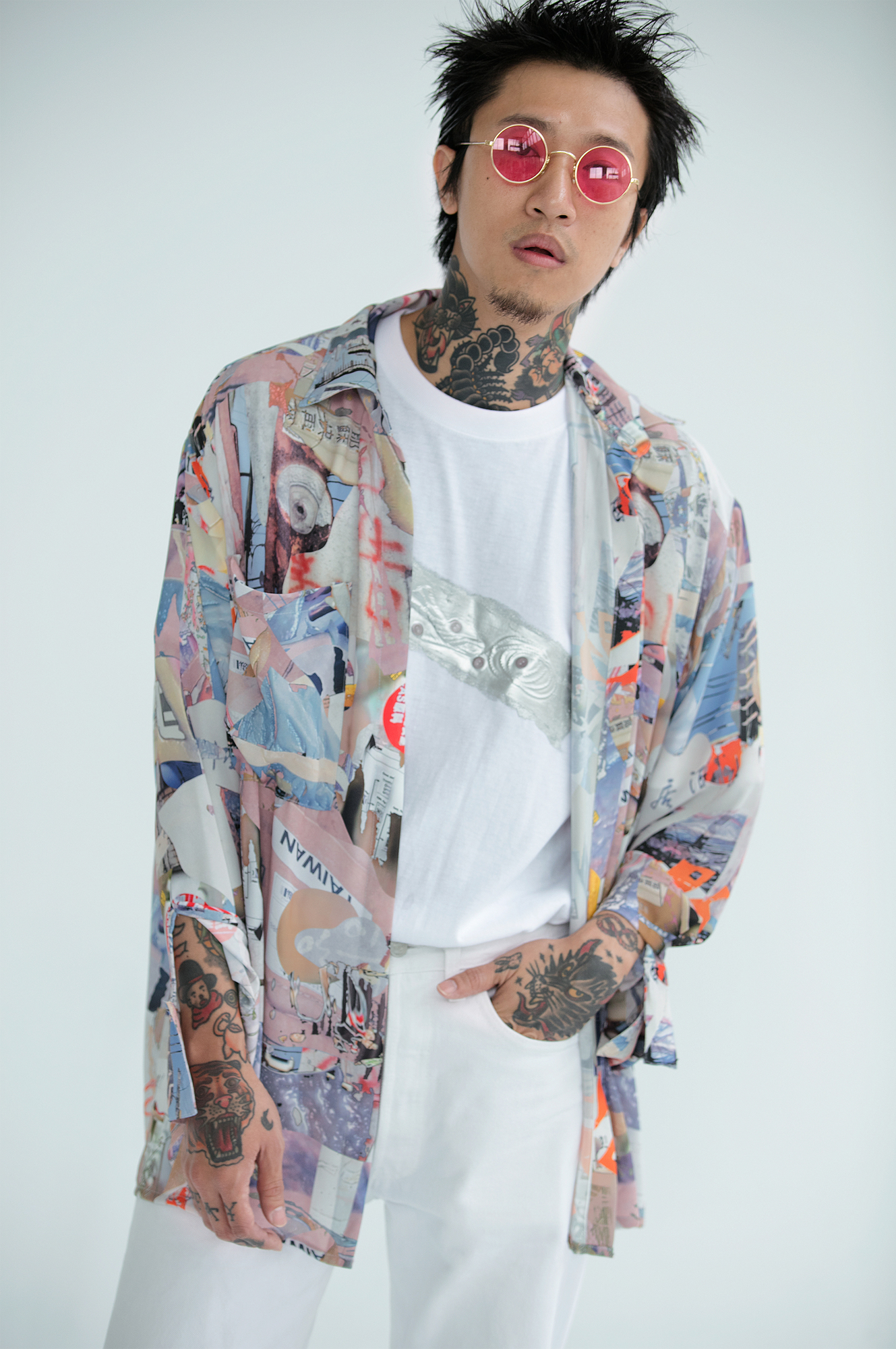 身上的刺青圖案也是一種搭配, 所以平時只穿著簡單的休閒搭配。